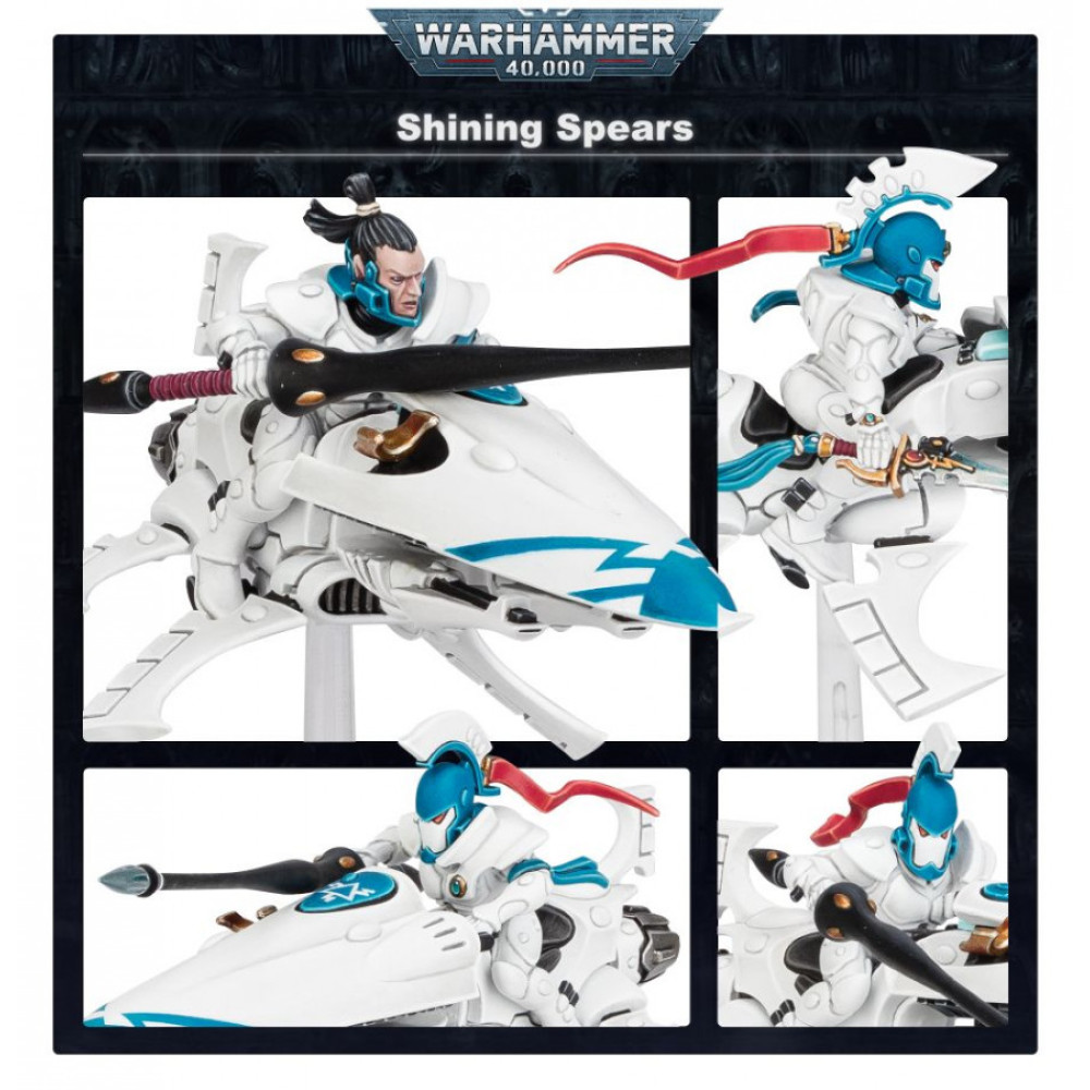 La mitología aeldari está repleta de nobles héroes montados en sus corceles, y en las Lanzas Brillantes se manifiestan las glorias de esas leyendas. Estos Guerreros Especialistas viven para cabalgar, y lo hacen a velocidades impresionantes sobre sus motos a reacción. Su arma favorita es una larga y formidable lanza láser, que proyecta una poderosa ráfaga de energía para abrir una brecha en el objetivo, instantes antes de que el grueso del arma se clave con una fuerza devastadora y penetrante.